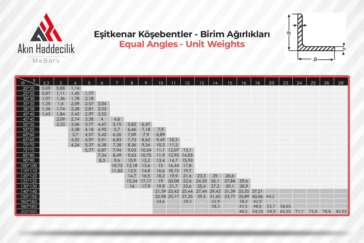 Akın Haddecilik demir çelik sektöründe ve başka sektörlerde çeşitli kullanım alanları bulunan Eşitkenar Köşebent demirini birçok farklı ölçüde, kalitede ve 3mt – 12mt boyları arasında üretebilme kapasitesine sahiptir. Üretilen bu eşitkenar köşebent çelik konstrüksiyonlarda, enerji nakil hatlarında ve tarım makineleri imalatı olmak üzere pek çok sayamadığımız farklı sektörlerde kullanılır.